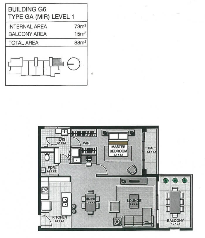 A study nook forms part of the main living area and the bathroom is 2-way, providing convenient access from either the main living area or the bedroom. The living room flows onto the balcony, allowing for indoor-outdoor entertaining. The whole floor plan including balcony is 88 sqm. One basement car parking space and a lockable storage cage are also included.